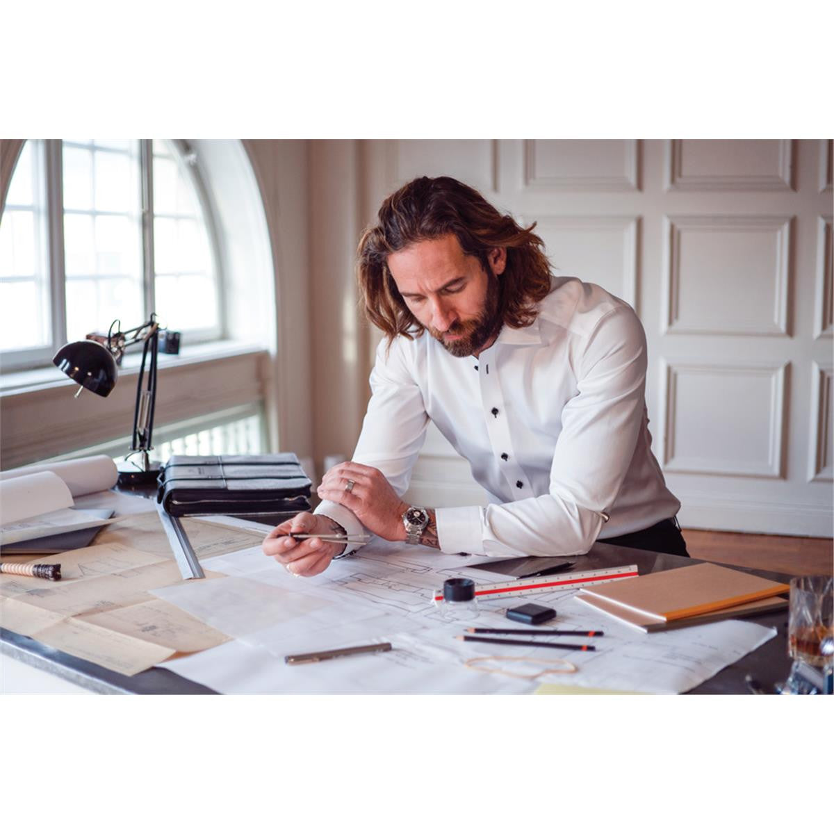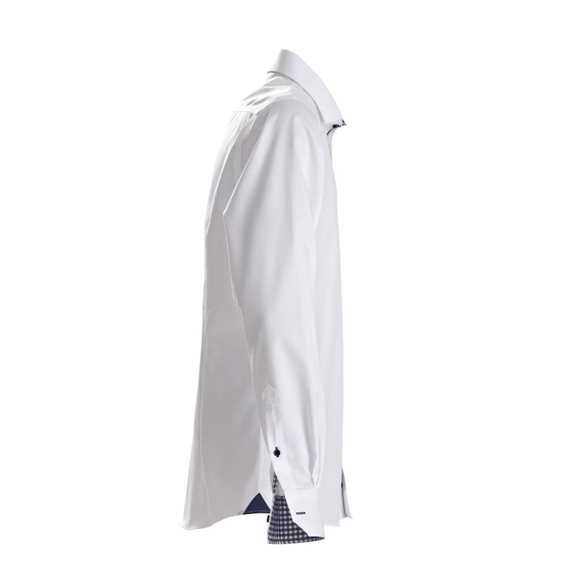Men's non-iron solid coloured dress shirt with contrasting check at collar and cuffs, crafted in high performance twill texture.
